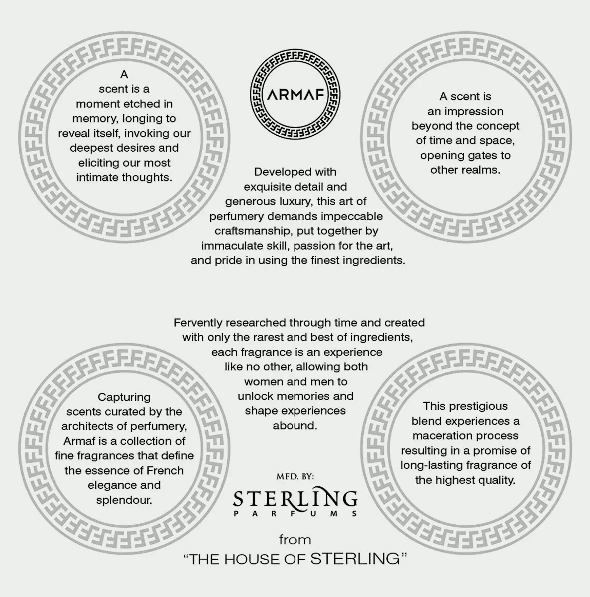 Launched by the design house of Armaf, this scent features geranium, jasmine, litchi, rose, musk, patchouli, vanilla, and vetiver It is a durable perfume that enhances attraction and is gentle on the skin. Ideal for day-to-day use.