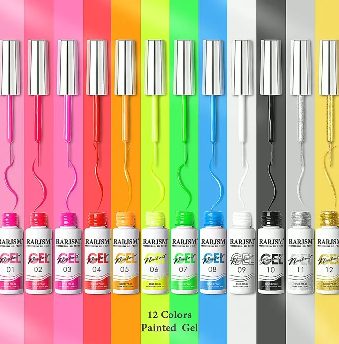 Presenting a fresh nail paint kit with 12 neon colors. Each bottle contains 8ml/0.27 fluid oz and acts as dual-purpose color gel polish and design gel.